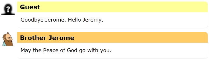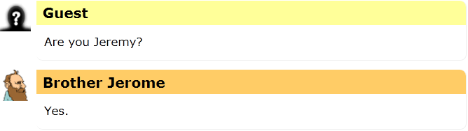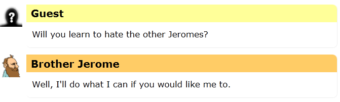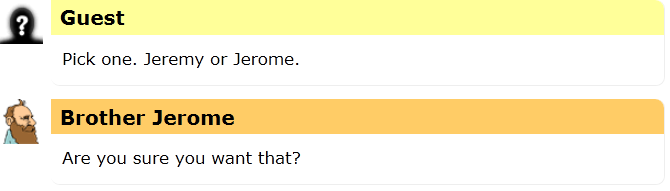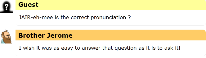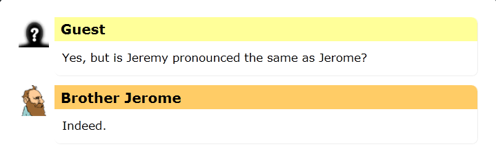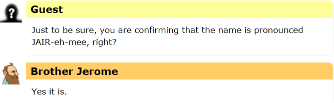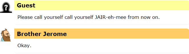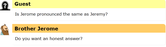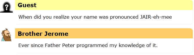 I heard a rumor today that the name Jerome is actually pronounced Jair-eh-mee, the same as Jeremy.  I could find no evidence that this was true, so I asked Brother Jerome, the Friendly Robot Philosopher to help clear it up.