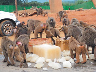 That is not a giant bar of soap that the baboons are attacking.  It is icy fruit the delicious summer treat that no monkey can resist.  One time I was driving through this zoo and all these monkeys were jumping up and down on top of my car and this one little monkey had a real angry face and he kept jumping on this one spot with extra force and he made a dent in my roof.  So I reached my hand out and tried to swat him off but he bit my hand with those tiny sharp monkey teeth.  Then he jumped back and wagged his finger at me as if to say NO! and all the other monkeys were jumping and making noises like they were laughing and all my friends were like you got dissed by a monkey.