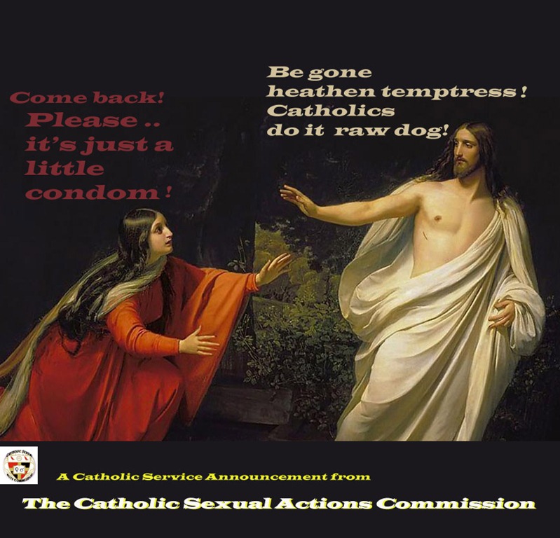 And a Jesus like figure pushing her away with his hand saying, “Be gone heathen temptress! Catholics do it raw dog!”