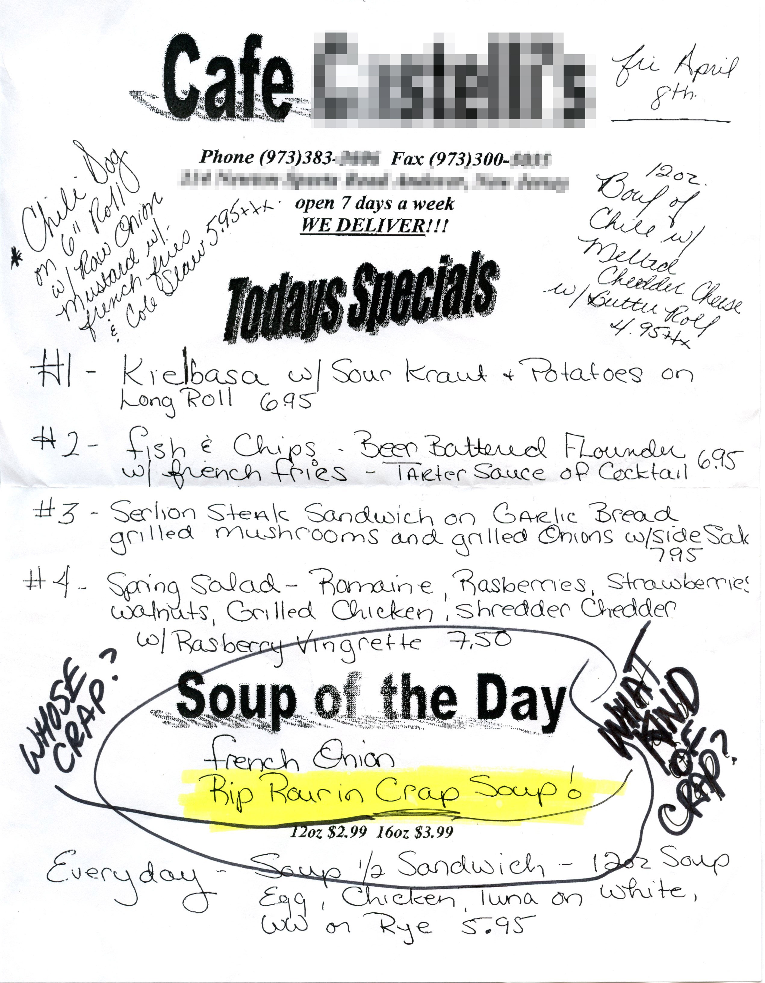 A local restaurant faxed their lunch menu to the office of a friend with an unusual lunch special– Rip Rourin Crap Soup. The friend faxed the restaurant back a note inquiring “Whose Crap? What Kind of Crap?” They received no response.