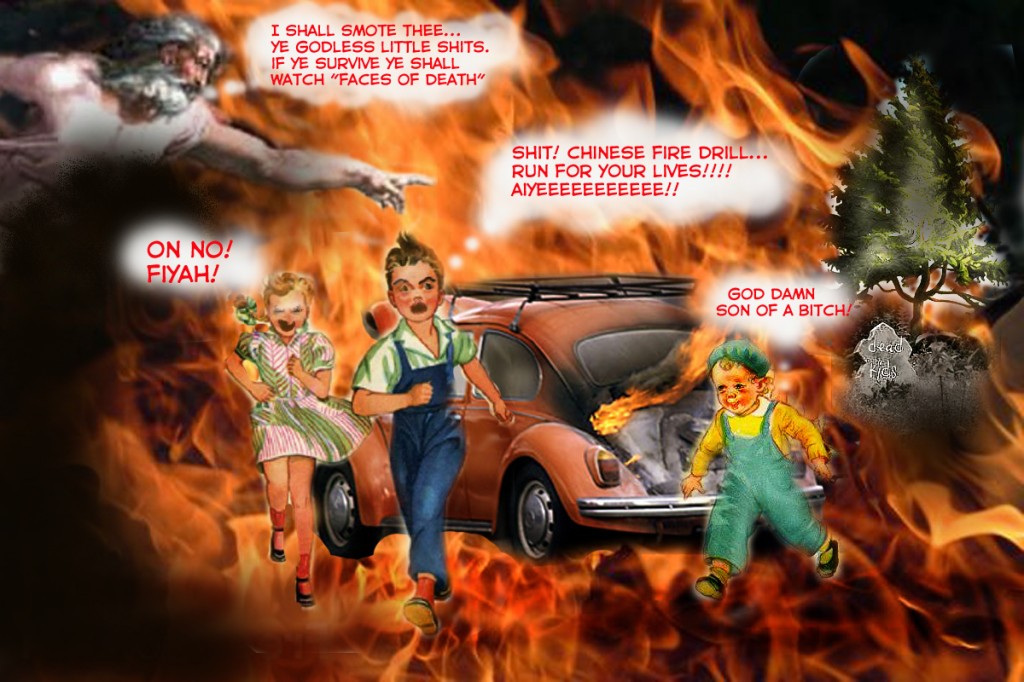 It was fun but I was scared out of my mind back then, because I was one of the smaller kids and they kind of just pushed you out of the car to get you out of their way so that they could run around it, you were forced to go whether you wanted to or not, kind of like going up to get communion in church if you happened to sit on the outer most edge of the pew. If you didn’t go everyone would look at you and know you didn’t go to confession, therefore you must be hiding some terrible mortal sin, then again if you didn’t go to confession and went up to get communion God would smote you something awful, only sometimes they would pretend to not let you back in the car as the light was changing, never was I not let back in the pew at church, so you would be standing there in traffic crying for a few seconds while horns blared. Anyway, yeah it started me to thinking of all the other unsafe things I used to get to do as a kid, and it all makes sense because the guy who let us do these things, not even let us but encouraged us, is totally nuts, like full on been committed to the state mental hospital nutsification. Don’t get me wrong I still have fond memories of those days, those dangerous days, and I loved going over to his house because there were no rules and we got to watch faces of death and race around on suped up big wheels and play war kittens with real kittens and pee in the woods. I just wonder how we survived physically unscathed, and there were about 8 of us kids, and I wonder if before I had full recollection of things if there had been more, only they died when he piled 15 of them all under the age of 8 into the back of a pickup truck and then went 80 on a bumpy back road laughing all the way while they screamed in terror and tried to hold on for dear life, my cousin got a concussion once on one of our trips to Rosie’s Pizza, the kind where your eyes roll up in your head and you make moany uncoordinated zombie movements whenever someone touches you. He made him walk it off. To all those kids they never told us about who never made it under his charge I salute you because you died like heroes. I bet they are in unmarked graves under the pine trees in his yard where he buried the chihuahua that swallowed hot dogs whole."