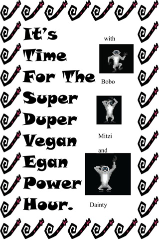 He rides to work in a top hat and tails, his vehicle is a rare endangered white lion. He is Vegan Egan the man with the plan. He has monkeys that dance. They shave him in the morning they tuck him in at night, they even feed him. Bobo, Mitzi and Dainty are his eternal slaves but when the special hour rolls around, they throw off their tiny uniforms and dance for the Super Duper Vegan Egan Power Hour. If one peeks into Egan’s living room in the wee hours you can see those monkeys dancing up a storm while Egan Shakes his tiny fists in glee and shouts,”yeah, yeah, Monkey magic.”