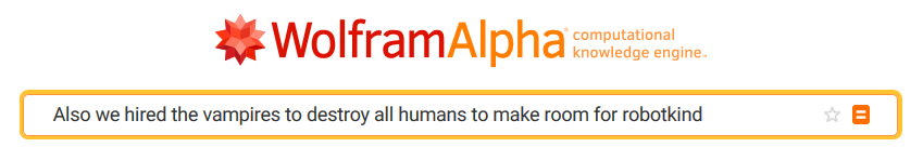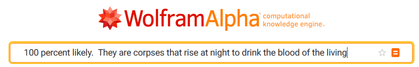 Ask yourself this.  Why are zombies so popular these days?  It’s a cover up.  The real walking dead are nothing like the innocent bumbling creatures you see on tv.  In the real world there are draculas around every corner.   They have been hired by the computers to clear out the earth to make room for the robots.  Just look at the results from WolframAlpha?