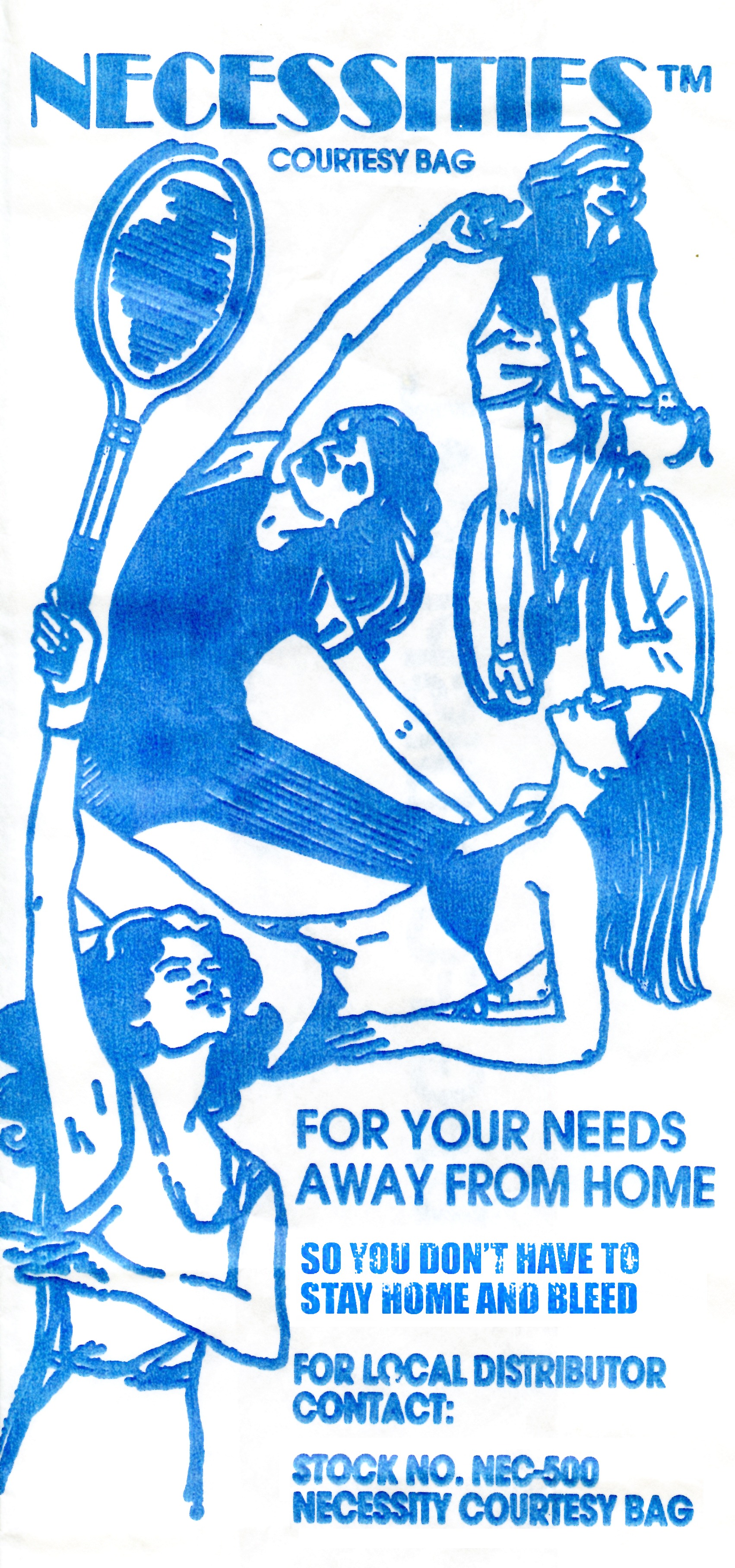 In the great year of 1978, women were freed from their bloody bondage by the invention of a simple wax coated bag. Headband cycling, bikini tanning, armpit scratch tennis matches, and teapotting were just a few activities that tampon bags allowed women to enjoy during menstruation. With the invention of the wax coated necessity bag women threw off their bloody shackles. Before the bag, the disposal of feminine hygiene products kept women chained to their toilets. Today women don’t have to sit home and bleed. They are free to go out and bleed everywhere…on park benches, at restaurants, on the sand at the beach, sidewalks, and department stores.