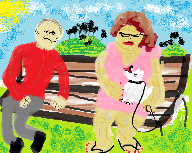 that poor dog no wonder he’s bitter look at that lady’s veins all over her arms and legs, but atleast she paints her toenails. that old man has a giant head and hip dysplasia it looks like.